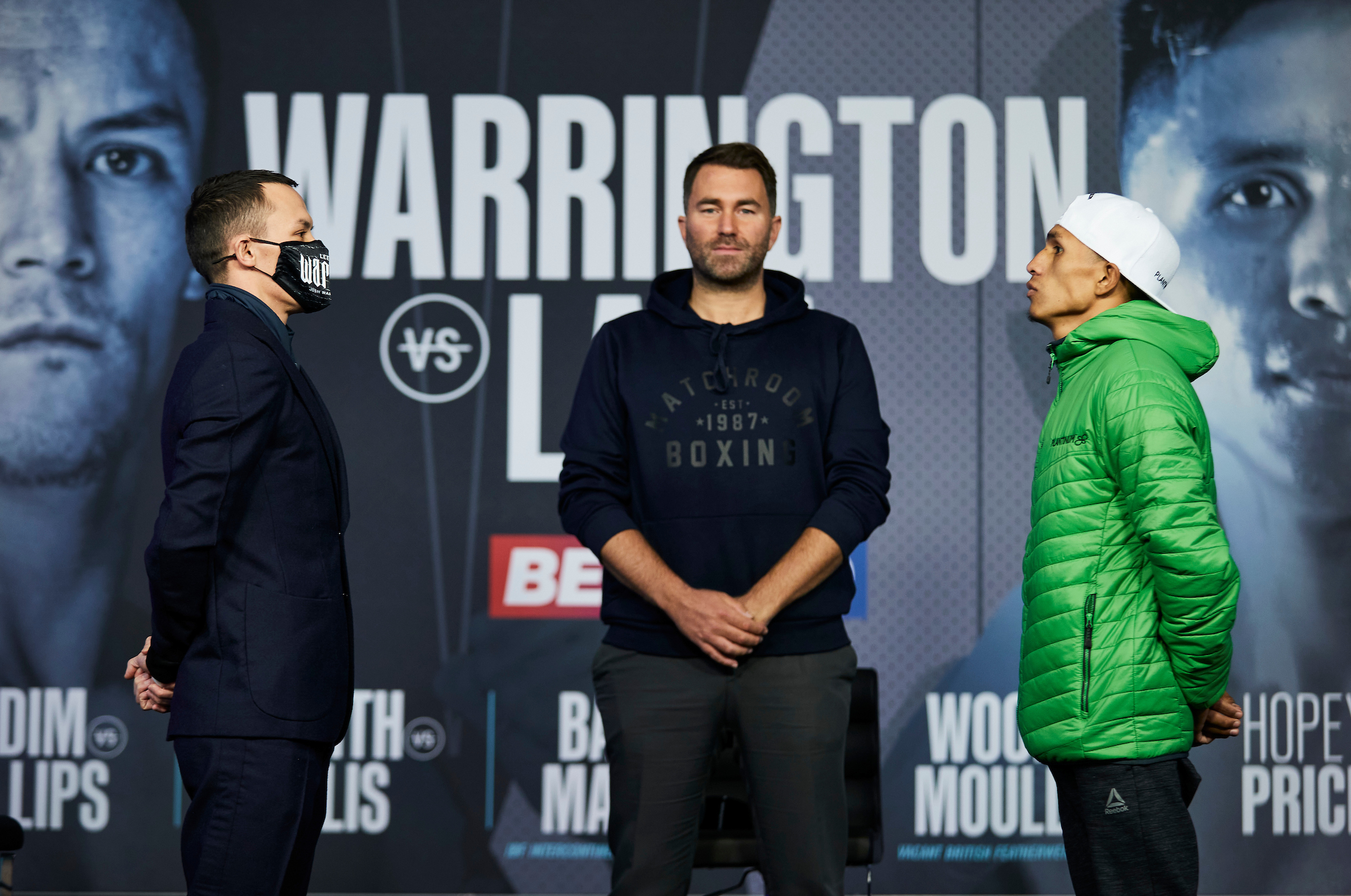 “Thanks Chris, Darren and Andy, joining us live on Sky Sports as well. We are so happy to be back! 2021 here we go. We’re back behind closed doors but it doesn’t matter. This is the biggest year yet for Matchroom Boxing as we go global. The start of twelve shows in eight weeks, in seven different countries. Firstly, this Saturday live on Sky Sports in the UK and DAZN around the world. The return of the No.1 Featherweight Josh Warrington against Mauricio Lara. Kiko Martinez against Zelfa Barrett, Reece Mould against Leigh Wood, Dalton Smith against Ishmael Ellis, Hopey Price against Mendoza and this one to kick us off, Ibrahim Nadim against Jonny Phillips.”